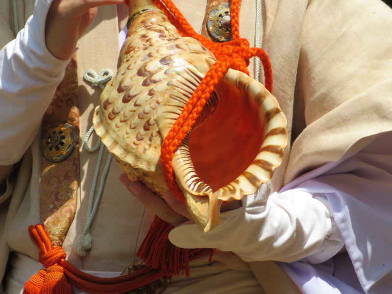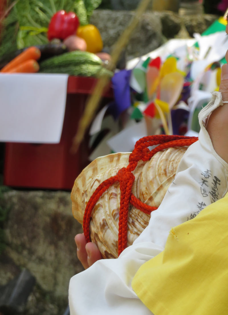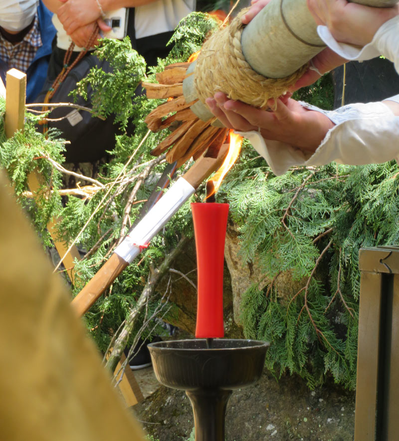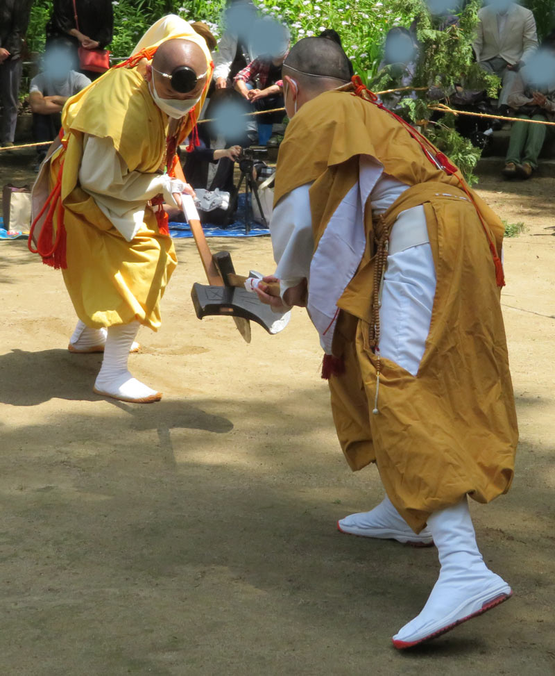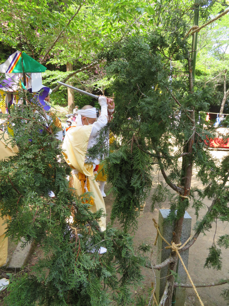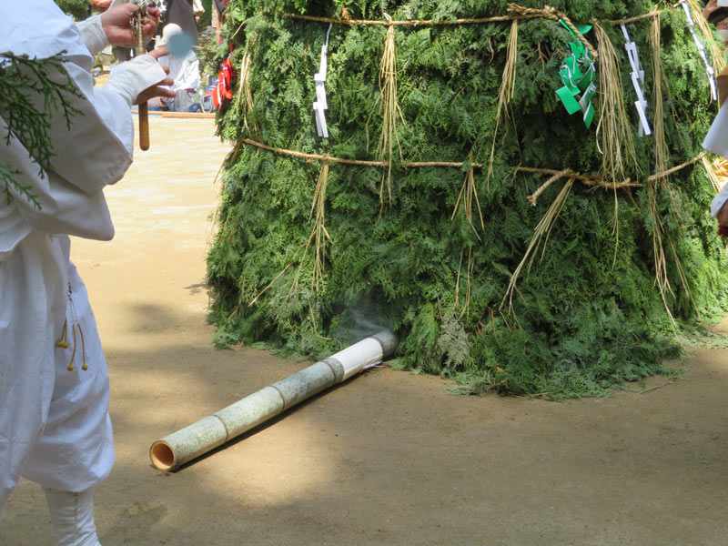 縄と御幣で作られた結界を「エイッ」と切って入場